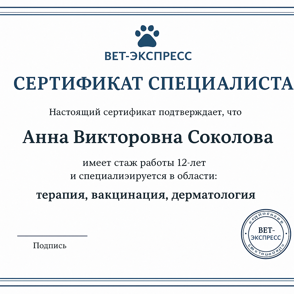 Анна Викторовна известна внимательным отношением к каждому питомцу, сочетает высокий профессионализм с заботой о здоровье животных.